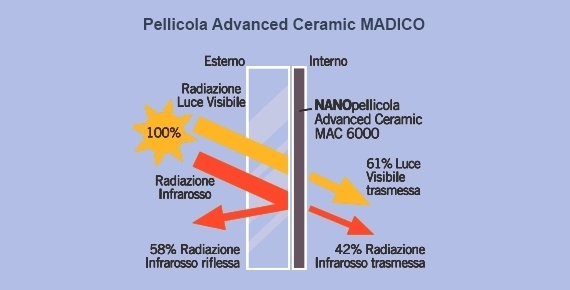 Le pellicole Advanced Ceramic Madico vengono prodotte con tecniche altamente sofisticate che sfruttano le innovazioni della nanotecnologia. Questo garantisce processi produttivi molto più selettivi rispetto a quelli disponibili con altre tecnologie e pellicole qualitativamente superiori. Il risultato è quello di realizzare pellicole ad elevata riflessione di raggi infrarossi e trasmissione luminosa. Tutto questo lasciando la visibilità quasi inalterata senza cambiare il cromatismo dei colori.